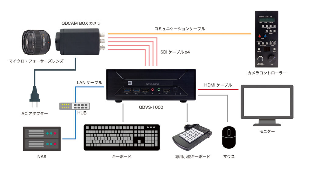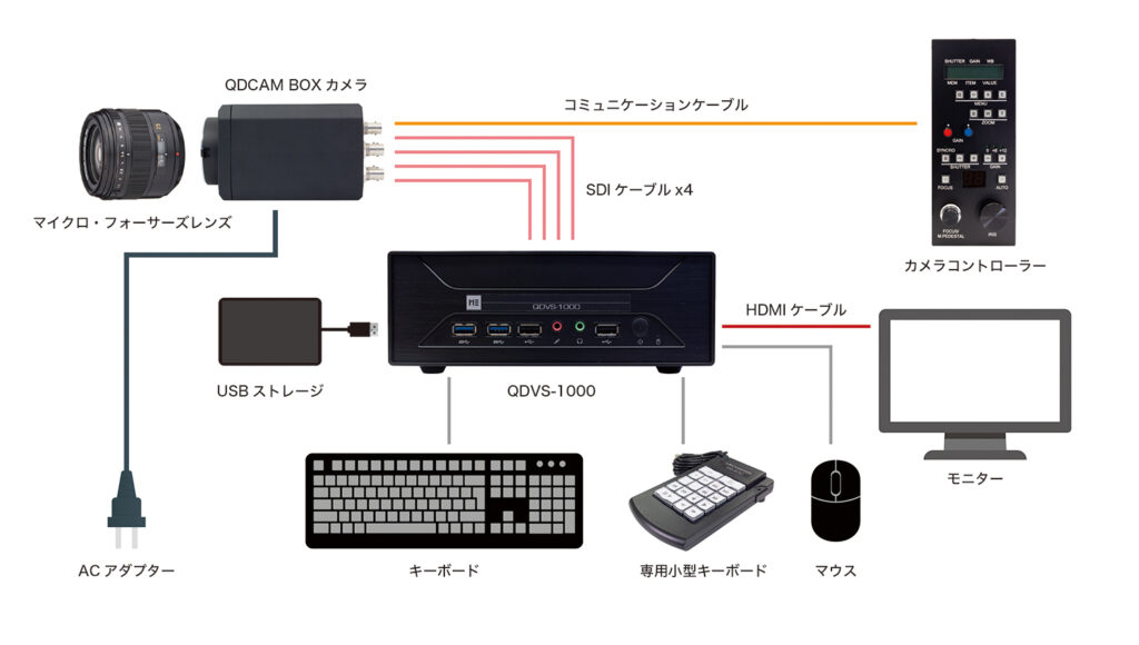 製品構成:QDVS-1100本体、ACアダプター、電源ケーブル、キーボード、マウス、専用キーボード